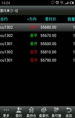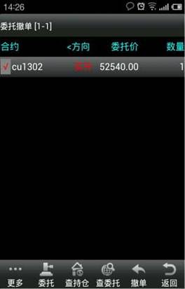 ◇ 查委托:點(diǎn)擊“查委托”,進(jìn)入委托單界面,可以查看到委托的合約、委托價(jià)格以及數(shù)