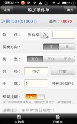 ◇ 成功添加條件單后,將按此價(jià)格添加一條預(yù)警消息。