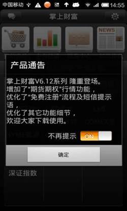 ◇ 顯示通告:設(shè)置掌上財富軟件登錄后是否顯示通知消息框,默認為“顯示通告信息”,