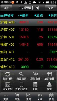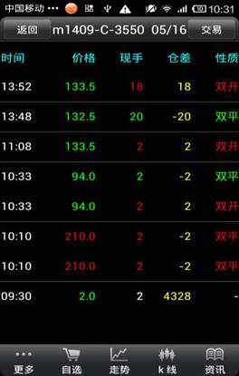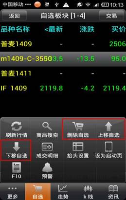 品信息,點擊“更多”可以商品搜索,刪除自選、上、下移自選,成交明細,抬頭設(shè)置,