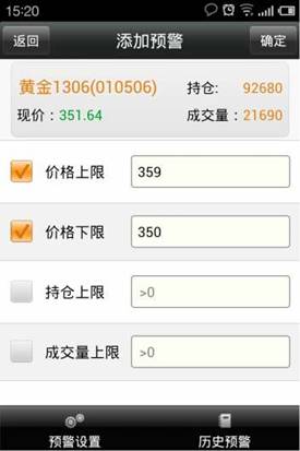 ◇ 可以對價格上限,價格下限,持倉上線,成交量上限做預警設(shè)置,價格上限和價格下限