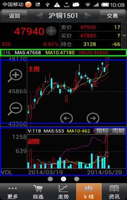 在主圖位置,點(diǎn)擊 + - 可以放大縮小 K 線